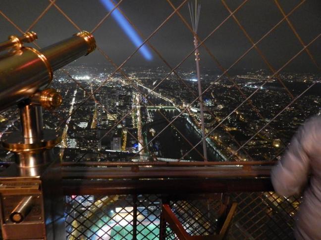 Ao final do dia, já extenuados, pegamos um táxi com destino à Torrre Eiffel, 11E com direito ao acesso de elevador até o topo, para aproveitar melhor o dia, que já estava no seu final. De quebra conseguimos uma vista incrível entardecer de Paris. Havia uma fila regular, mas nada de impactante, pois pelo que líamos poderia ter sido pior. Optamos por não comprar com antecedência o ingresso dada a exigência de visitação com dia marcado, o que preferíamos não usar, para usufruirmos de maior liberdade. Consideramos, assim, que no período de inverno encontraríamos filas menores. Em meia hora já estávamos no elevador, subindo! Há uma lojinha no topo da Torre Eiffel bem interessante, mas também nada muito diferente do que se vende em seus arredores, por preços menores.