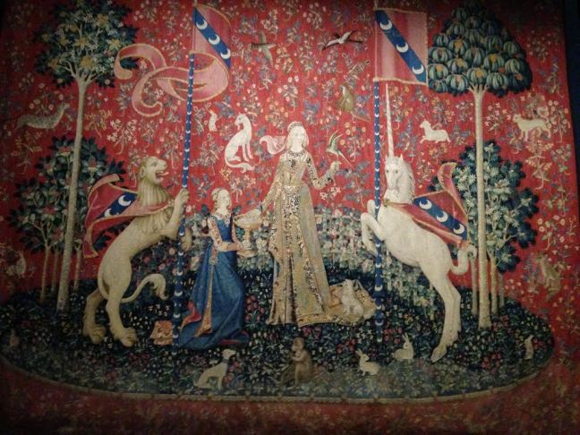 No Museu Cluny da Idade Média entramos para conhecer, (9E cada) como o próprio nome diz, artefatos domésticos, livros, vitrais, esculturas, vestimentas, joias, armamentos e tapeçarias que datam da idade média. As instalações do Cluny ficam em um castelo efetivamente medieval, onde salvo engano, funcionava um local de banhos termais. O sítio preserva a capela original pertencente ao castelo. Contudo, o carro-chefe do museu é o conjunto de tapeçarias intitulado A Dama e o Unicórnio, descoberto originalmente no castelo de Boussac, também na França. A mítica tapeçaria compõe-se de seis peças, cinco delas representando cada um dos cinco sentidos, sendo que a sexta permanece um enigma para os estudiosos da obra. Seus dizeres são algo como “ao meu único desejo”, grafado em francês arcaico sobre um dossel que protege a “donzela” ali retratada. Aos interessados em se aprofundar no tema, há farta leitura disponível na loja do museu.