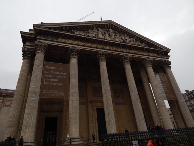 Compramos uma caixinha de framboesas, raras in natura em nosso clima tropical. Caminhamos pela manhã na via, com destino ao Panthéon, (e ntrada 7E cada) que estava mais ao topo, mas não diretamente na sequência, pois precisamos conferir no mapa a rota, dobrar algumas esquinas, desembocando por fim na parte de posterior do monumento. O local conta com uma bela arquitetura em colunas greco-romanas, e na sua cripta estão as tumbas de consagrados filósofos e pensadores como Voltaire, Rousseau, Victor Hugo e Emile Zola. Há também, no hall principal e superior, um memorial a Antoine de Saint Exupery (não sabemos informar se seus despojos encontram-se também ali). O acesso é livre para o visitante. Procurei pela exposição da réplica do Pêndulo de Foucault, que demonstra a rotação da terra e que tinha visitado anos atrás, mas havia mudado para outro local, no Musée des Arts et Métiers. A principal abóboda estava em reforma, substituída por imagens modernas como proteção até a conclusão da obra.