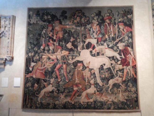 O Cloisters tem a honra e o privilégio de contar em seu acervo com alguns exemplares dessas peças de tapeçaria que, na era medieval, tinham como tema a caçada e a captura do mítico unicórnio. Supõe-se que sejam alegorias para a paixão de Cristo, que seria retratado simbologicamente como o unicórnio. O fato é que tudo que se relaciona a esses conjuntos de tapeçarias é envolto em muito mistério e ninguém sabe ao certo o que o tapeceiro quis representar.